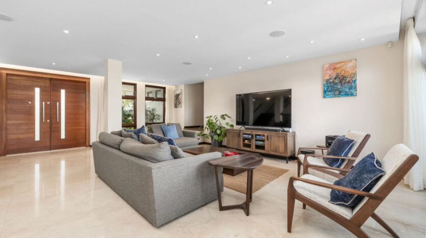 – A grand entrance foyer leads into a spacious living room that opens directly onto an infinity terrace.