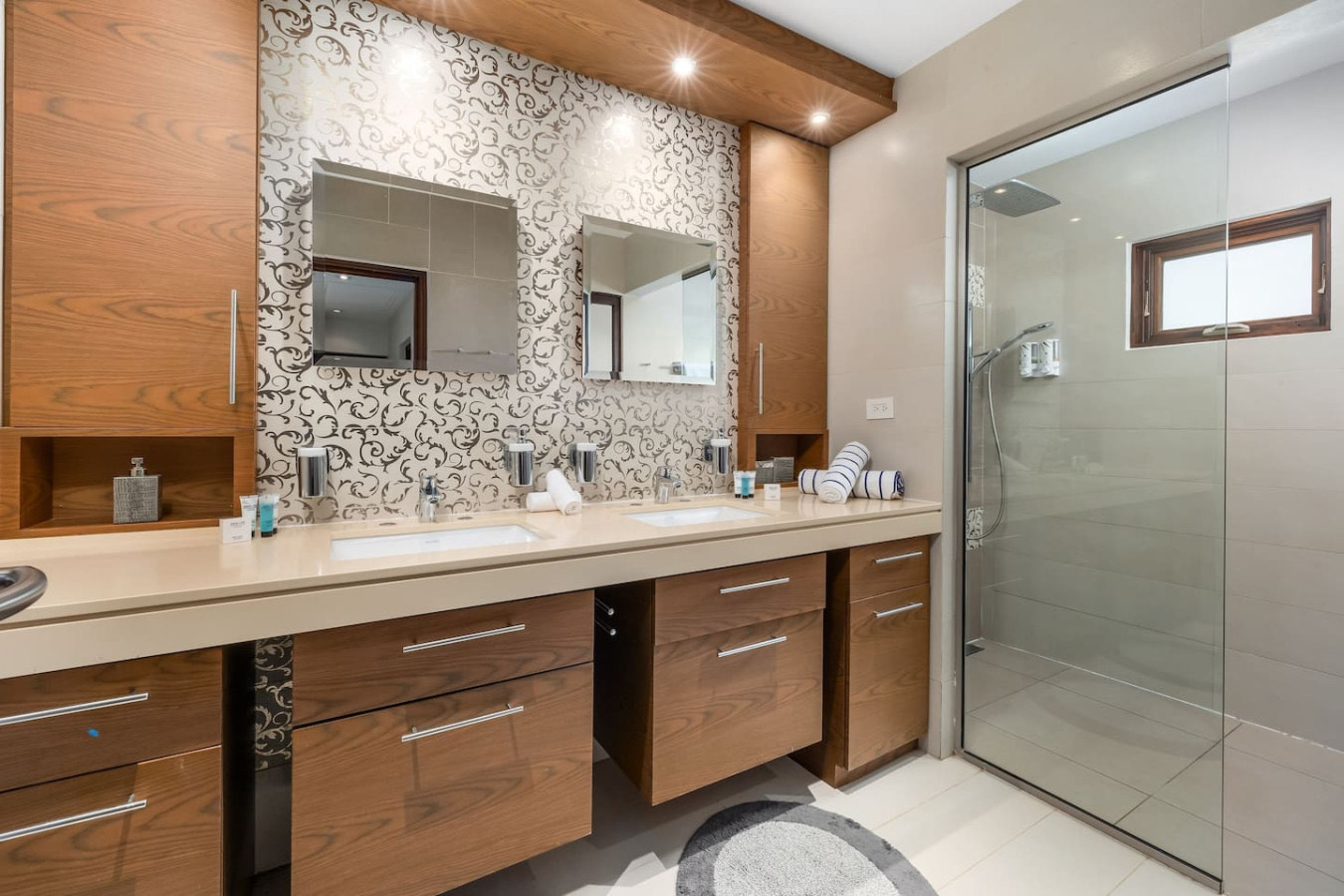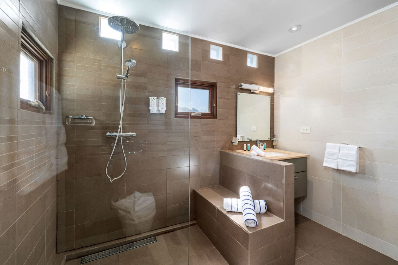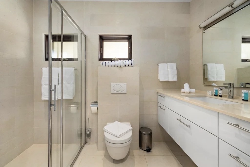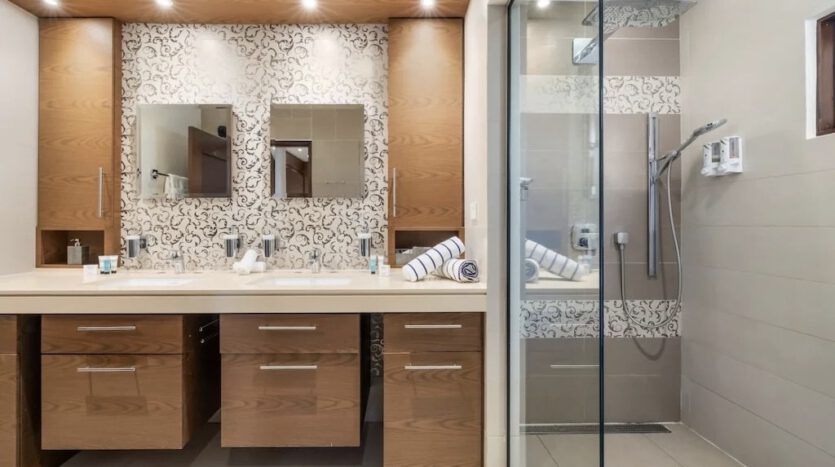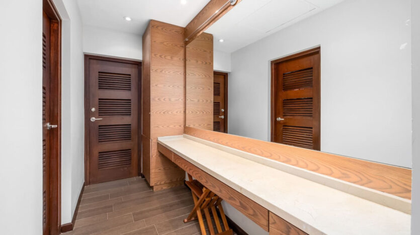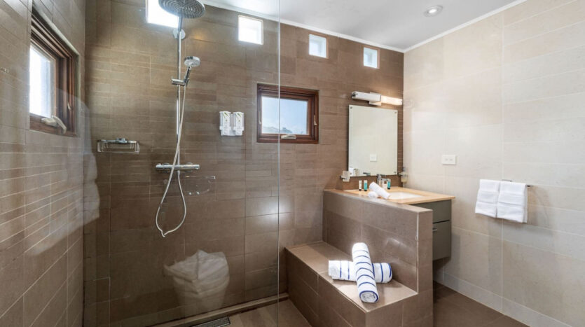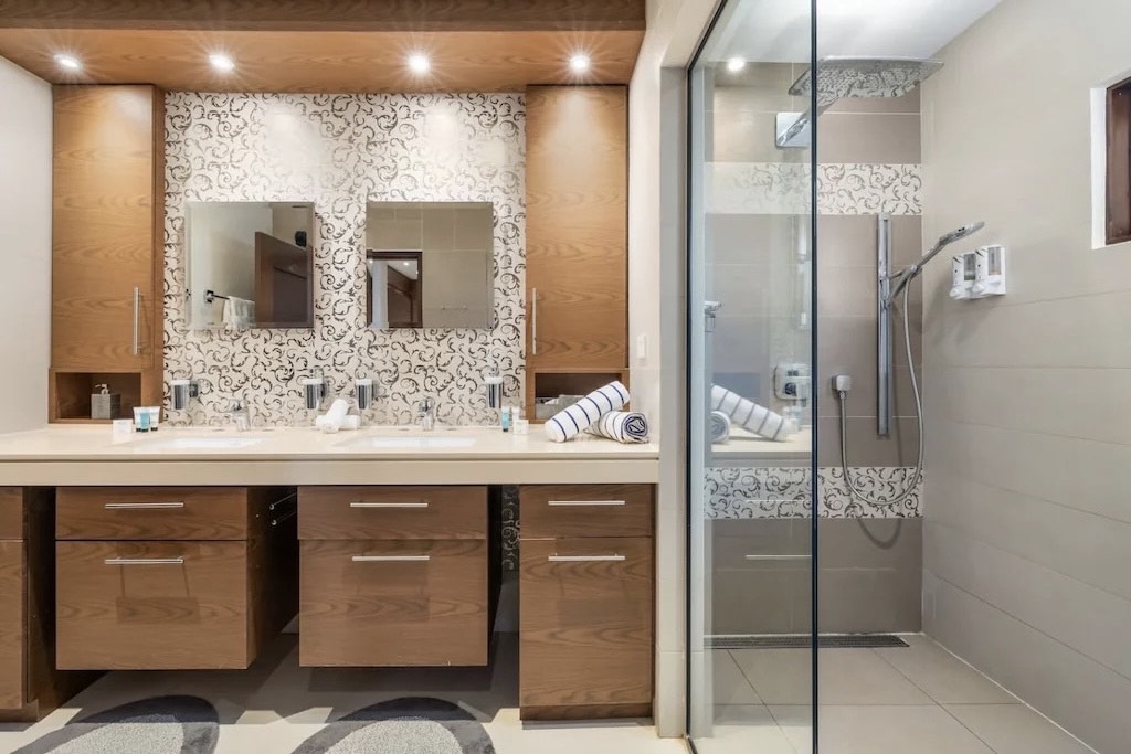 – Primary suite with ocean-facing terrace, spa-style bathroom, rain shower, and walk-in dressing room